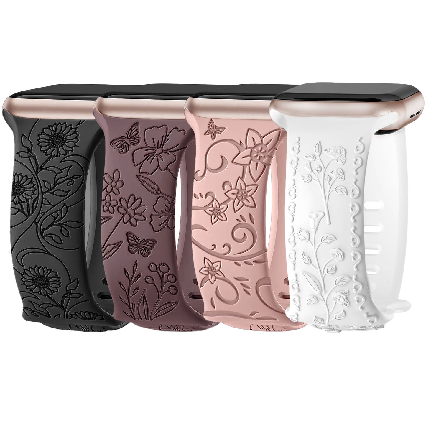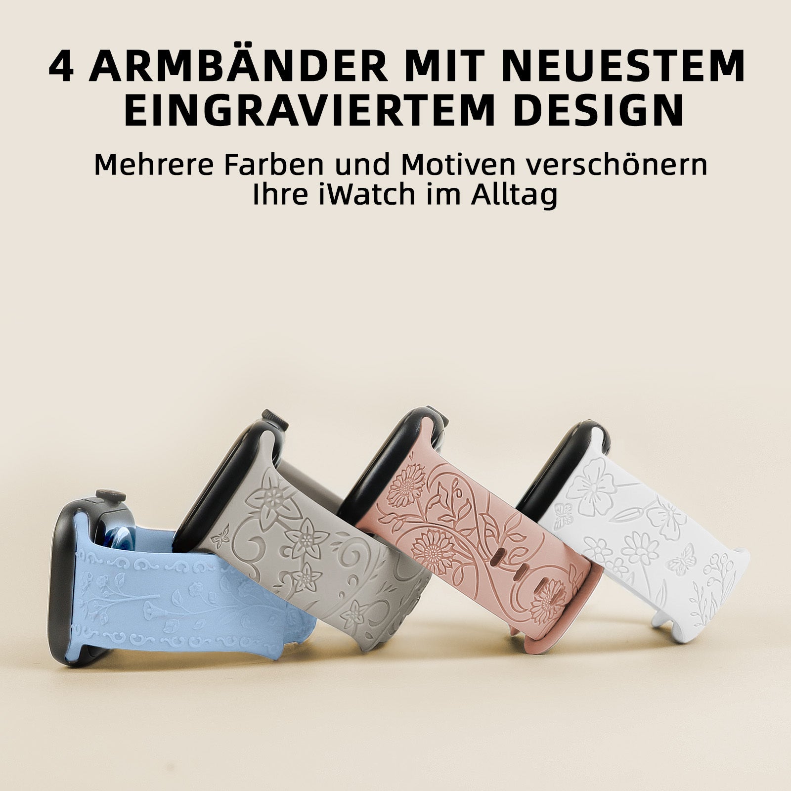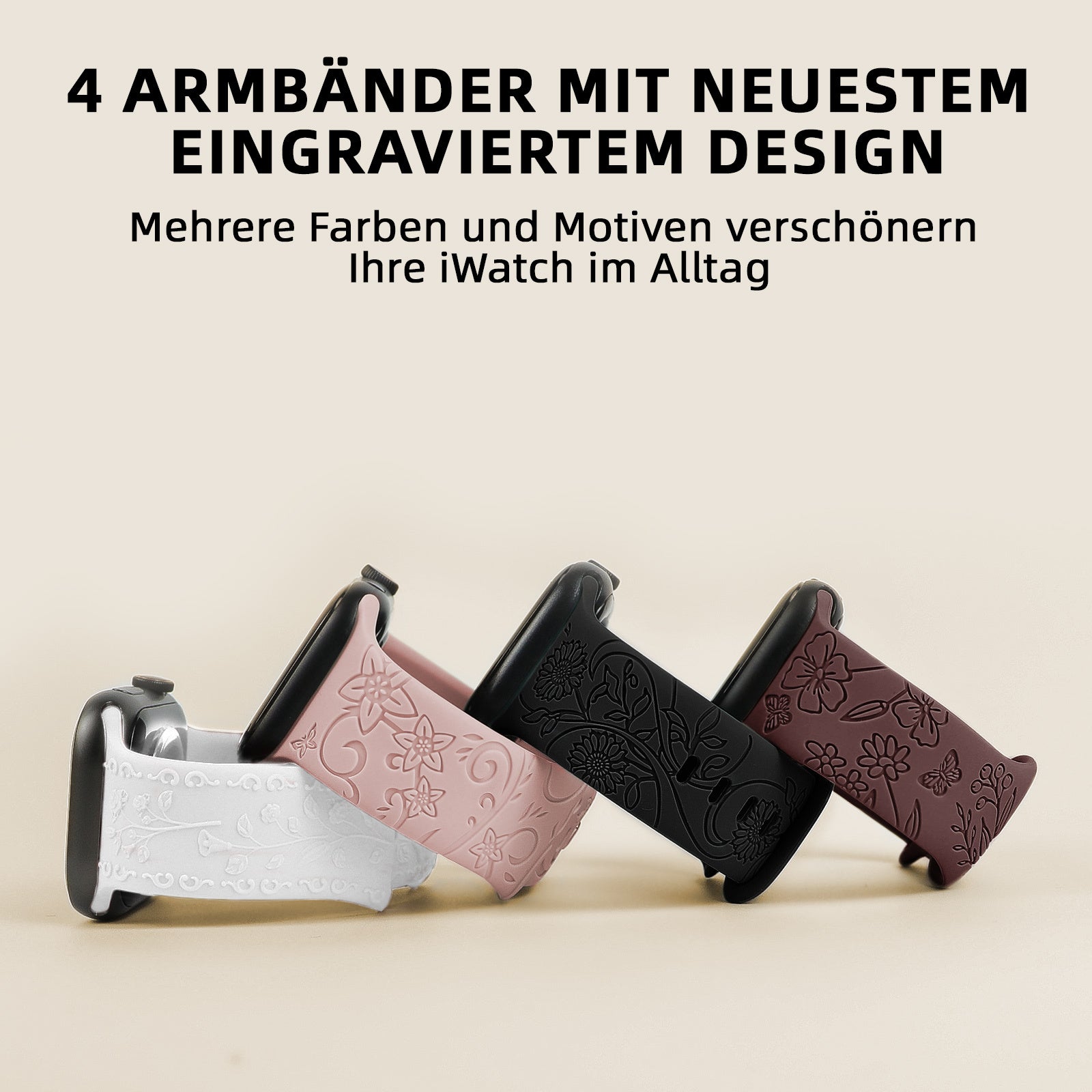 - 100% KUNDENSERVICE : Sie werden 4 verschiedenfarbige Armbänder erhalten, jedes mit einer anderen Gravur. Das feine und schöne floral Armband passt perfekt zu verschiedenen Outfits und lässt sich leicht an jeden Anlass anpassen. Wenn Sie auf Fragen über unser Armband für Apple Watch stoßen, Kontaktieren Sie uns und wir antworten innerhalb von 24 Stunden!